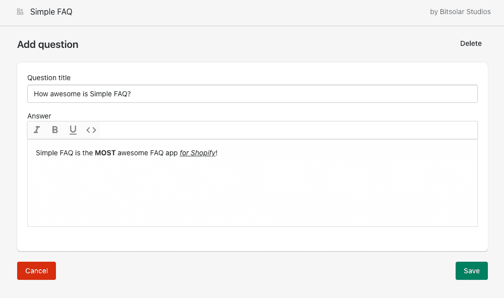 Simple FAQ is the easiest way to create FAQ lists for your Shopify store, without complex page builders or HTML knowledge.